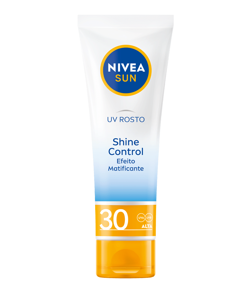 Proteção facial imediata contra os raios UVA/UVB com efeito matificante & 0% de sensação pegajosa e uma fórmula que respeita os oceanos. NIVEA SUN Creme UV Rosto Shine Control FP 30.