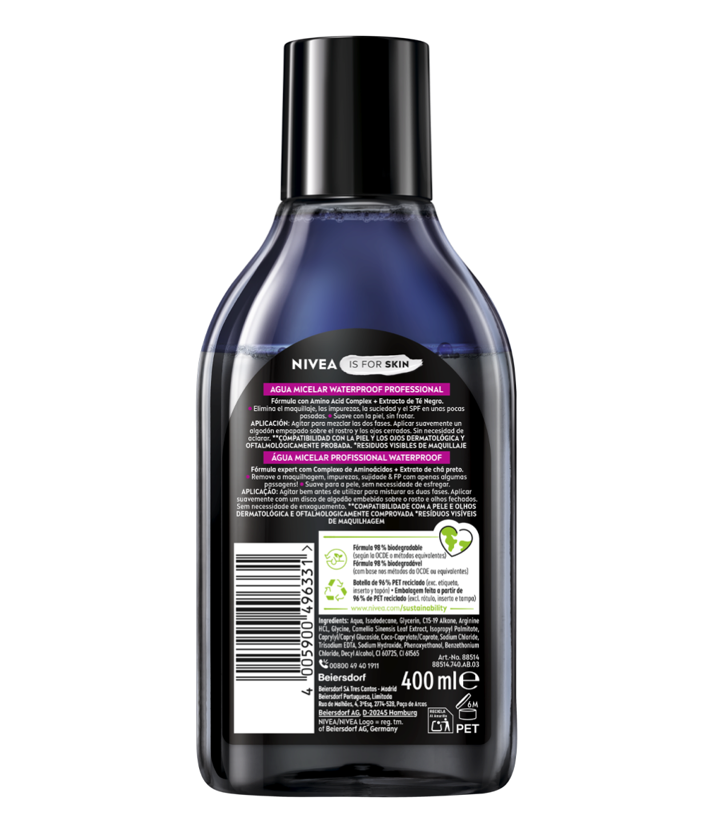 Água Micelar Profissional Waterproof remove eficazmente maquilhagem à prova de água, impurezas e sujidade sem necessidade de esfregar. A fórmula com Complexo de Aminoácidos e Extrato de Chá Preto é enriquecida com micelas de limpeza e aminoácidos suaves. Limpa profundamente os poros, ao mesmo tempo que protege e cuida das pestanas. Adequado até para pele sensível.
