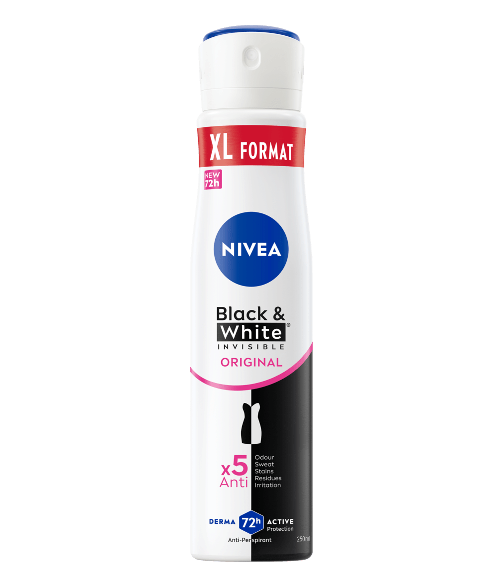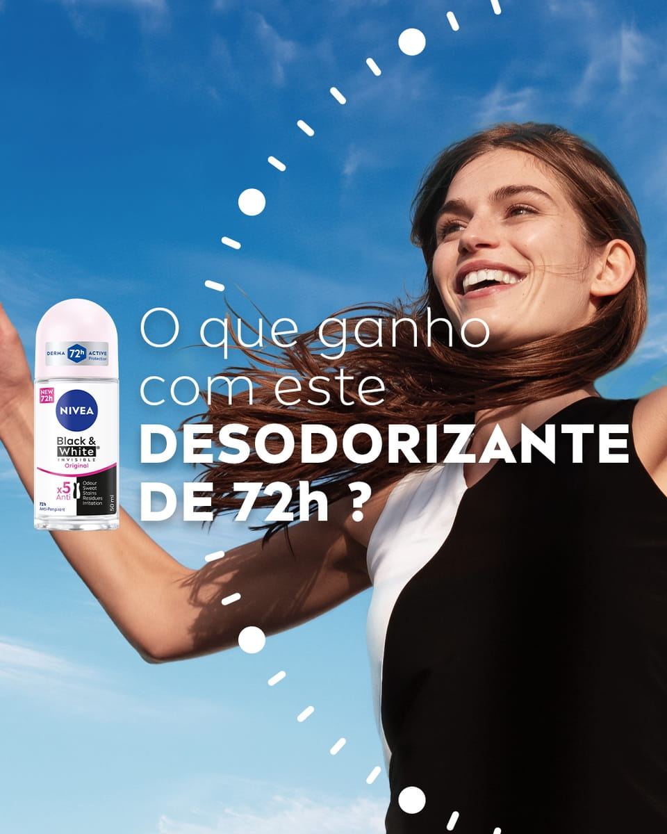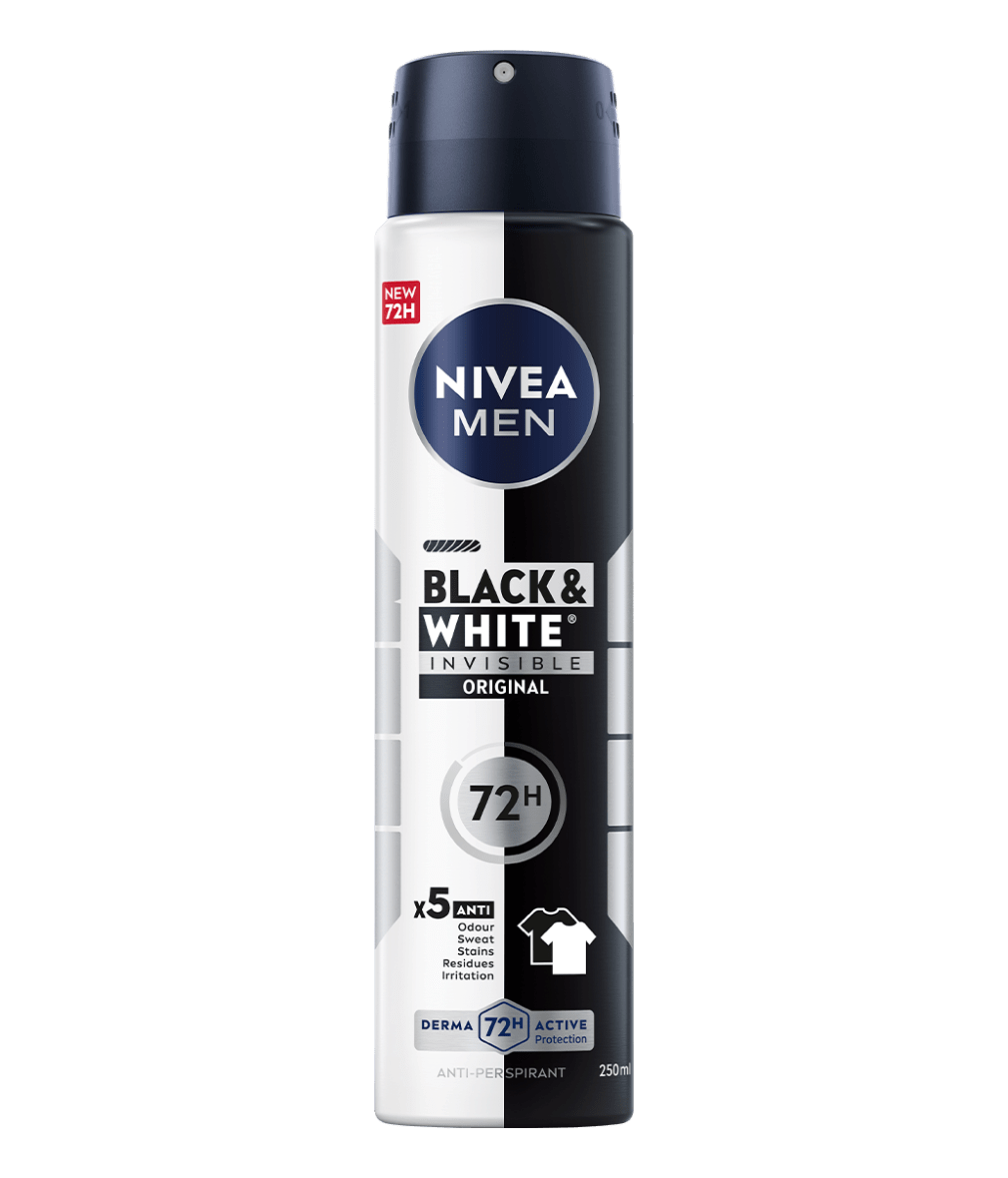 A gama NIVEA Black & White Invisible oferece proteção contra as manchas brancas na roupa escura e manchas amarelas na roupa branca, graças à sua tecnologia antimanchas exclusiva e patenteada. Proteção antitranspirante de 72h, forte contra o suor e os odores, que cuida da sua pele.