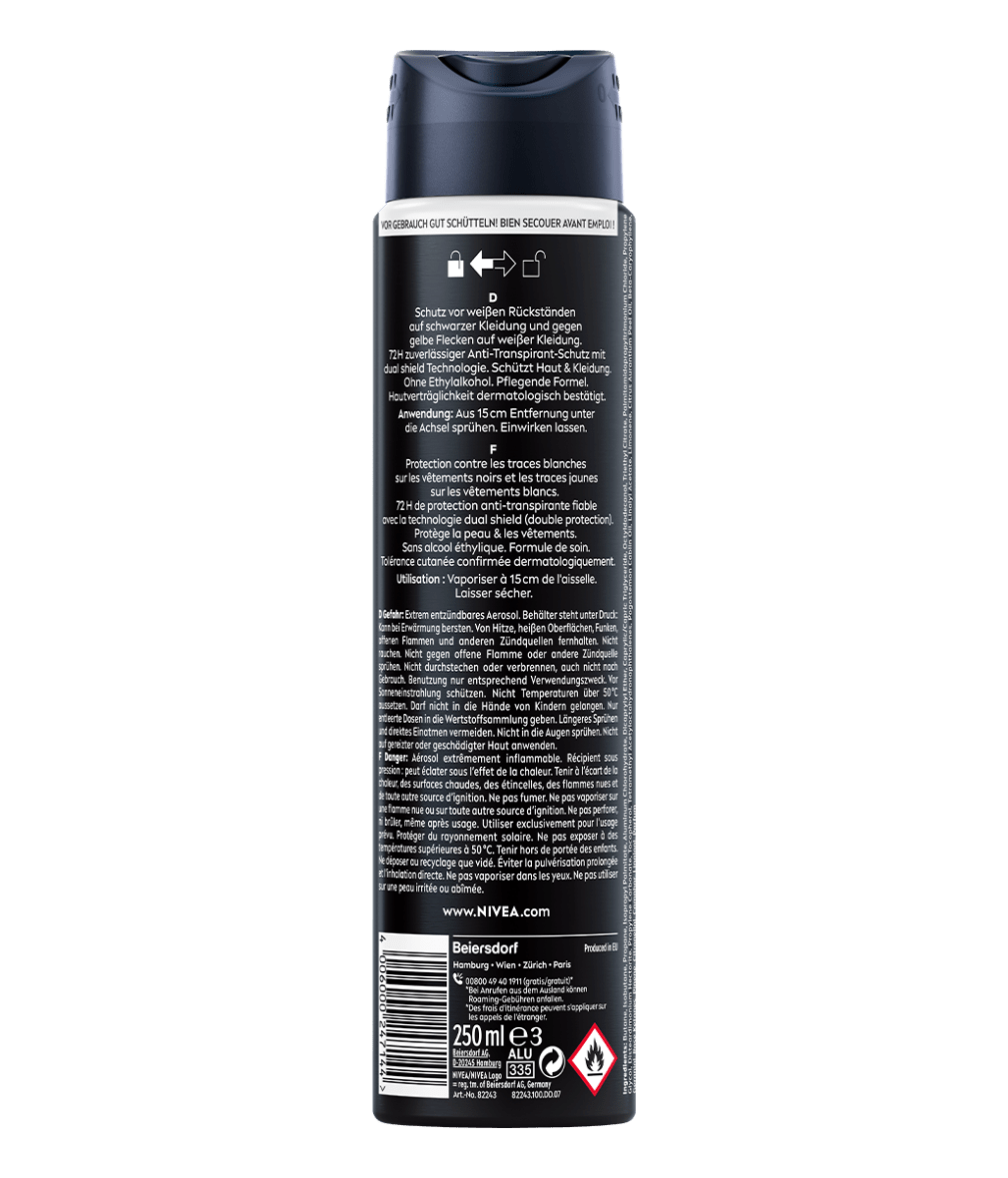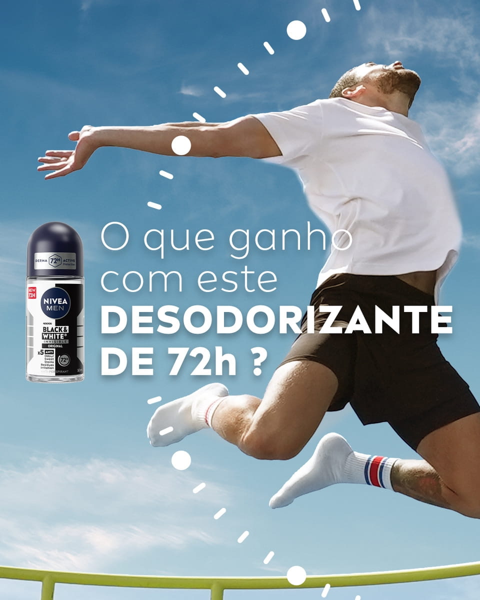 A gama NIVEA Black & White Invisible oferece proteção contra as manchas brancas na roupa escura e manchas amarelas na roupa branca, graças à sua tecnologia antimanchas exclusiva e patenteada. Proteção antitranspirante de 72h, forte contra o suor e os odores, que cuida da sua pele.