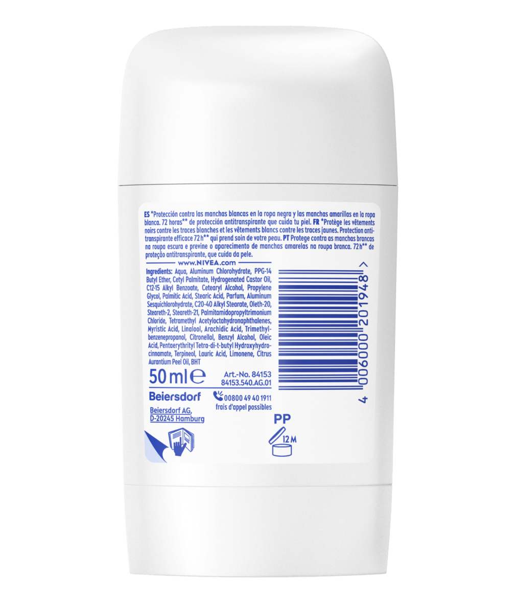 A gama NIVEA Black & White Invisible oferece proteção contra as manchas brancas na roupa escura e manchas amarelas na roupa branca, graças à sua tecnologia antimanchas exclusiva e patenteada. Proteção antitranspirante de 72h, forte contra o suor e os odores, que cuida da sua pele.