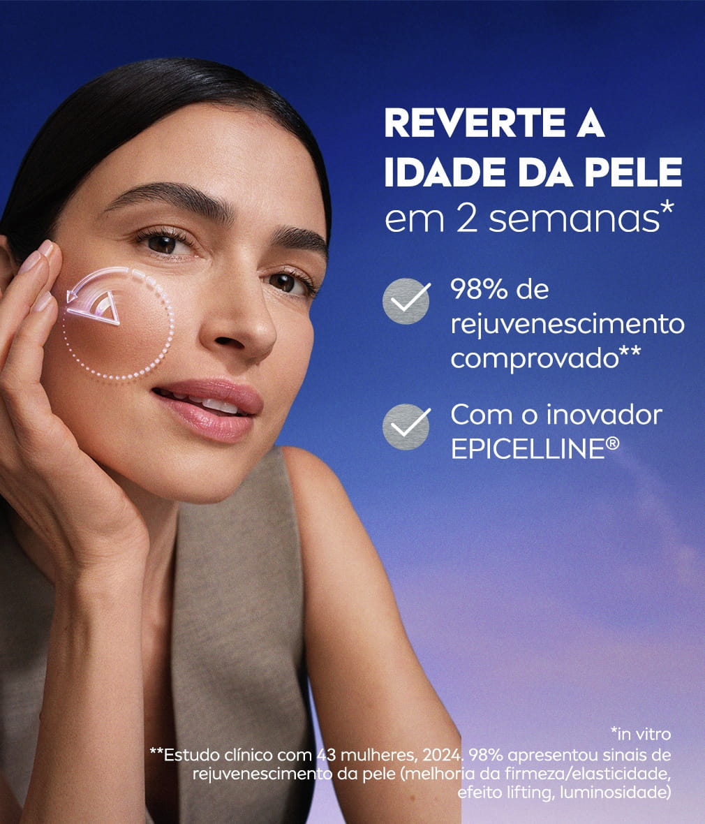 Experimente uma revolução no rejuvenescimento da pele - o novo Sérum com ingrediente Epigenético Epicelline® está cientificamente comprovado que reverte o envelhecimento da pele em 2 semanas 1. 98% de rejuvenescimento da pele comprovado.2