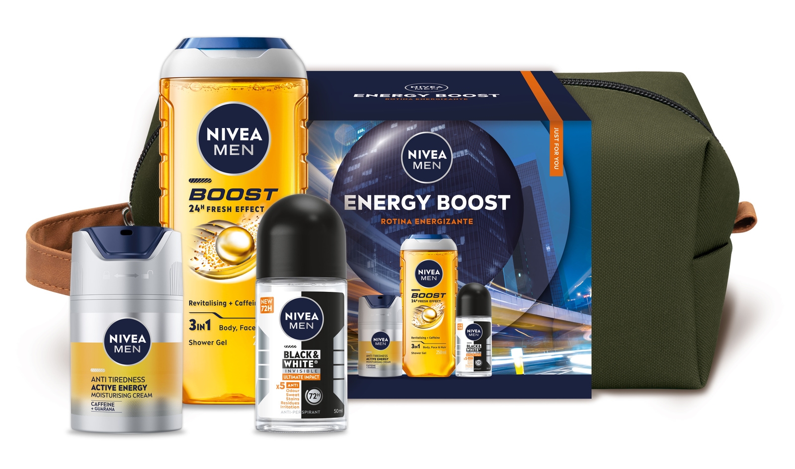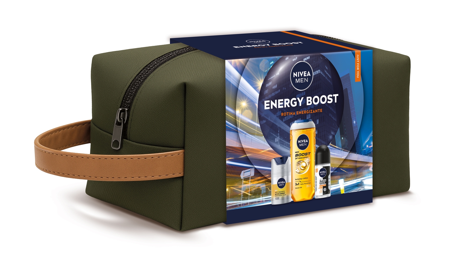 - NIVEA MEN GEL DE DUCHE BOOST: A fórmula refrescante com cafeína de origem natural é a companhia ideal para a tua rotina de despertar matinal. Deixa a tua pele e cabelo revitalizados e cuidados. Produto exclusivo deste kit. Encontra este gel l no teu Super ou de banho com 500m. Recicle no ecoponto Hipermercado habitual. amarelo.