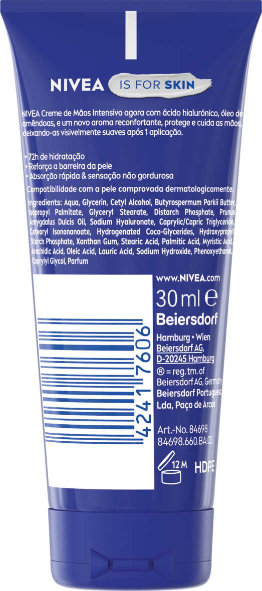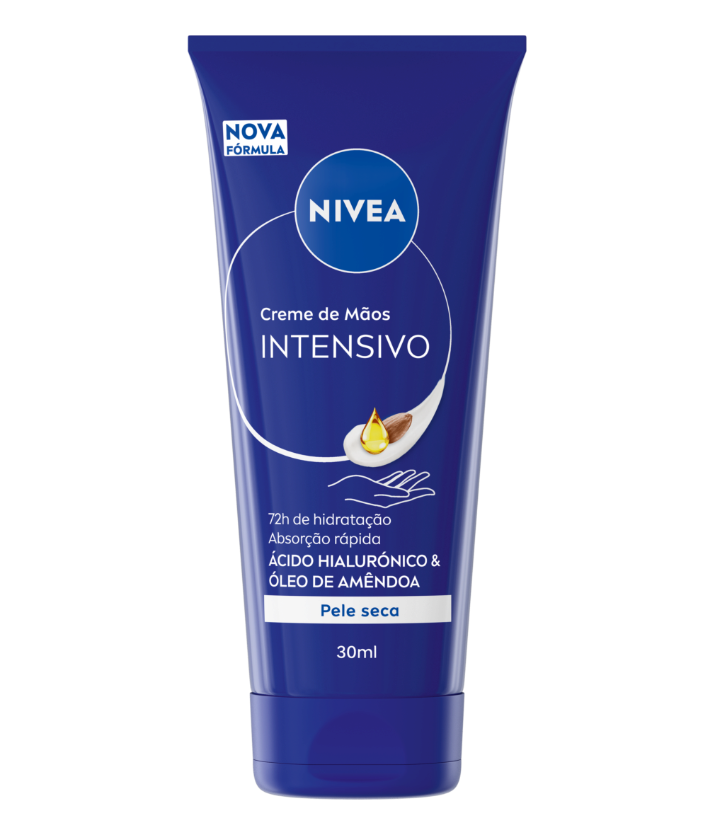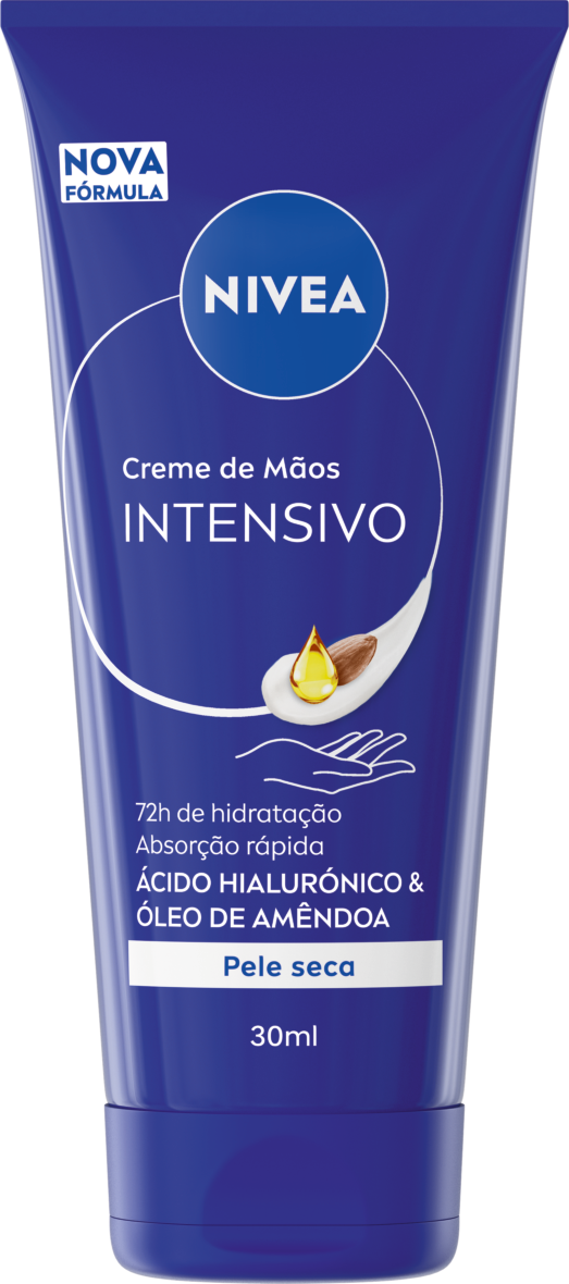 O Creme de Mãos Intensivo com Ácido Hialurónico e Óleo de Amêndoa proporciona 72 horas de hidratação e rápida absorção para mãos visivelmente suaves.