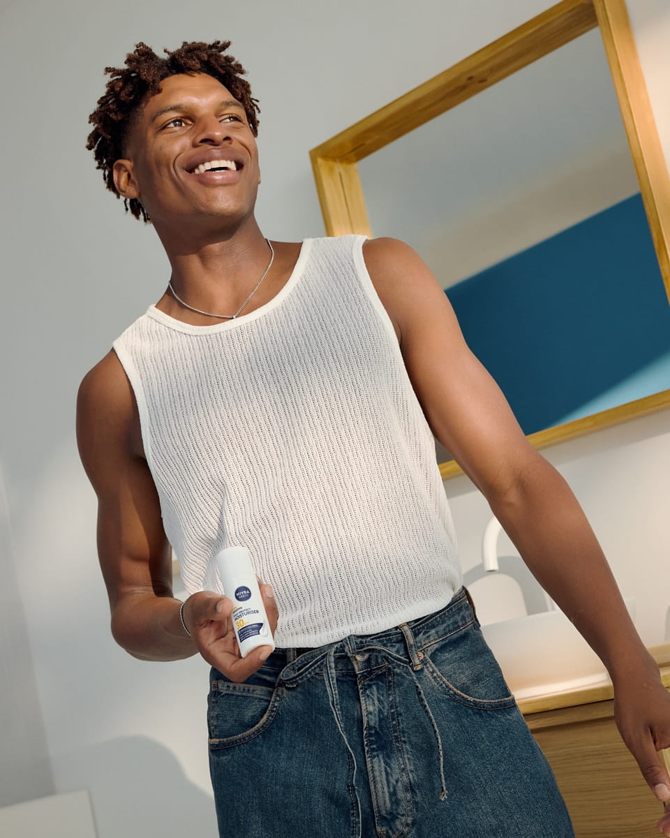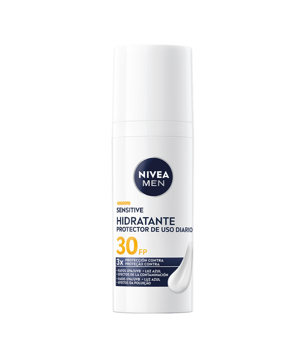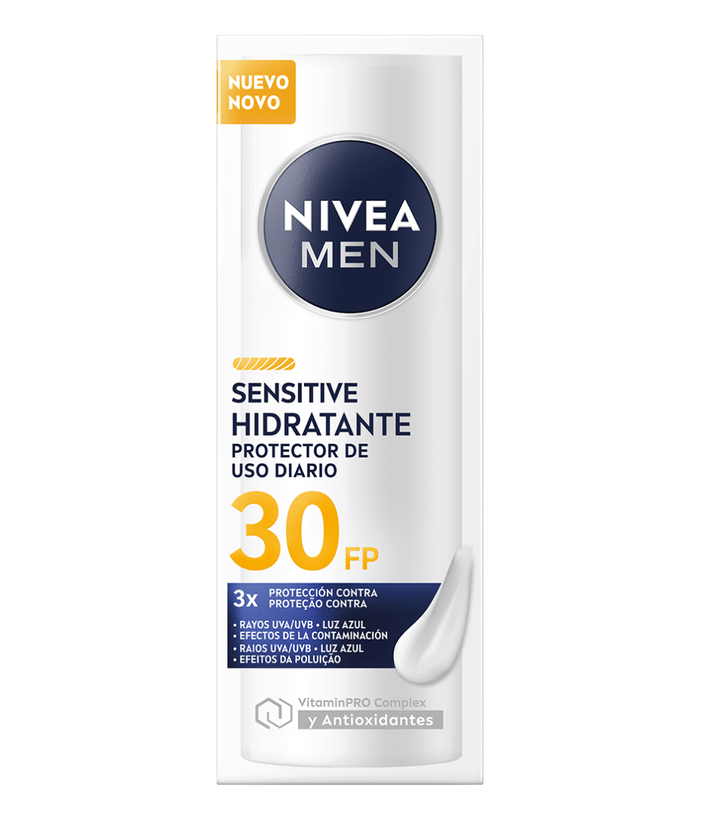 O NIVEA MEN Creme de Uso Diário Sensitive FP30 protege a pele sensível com FP30, VitaminPRO Complex e antioxidantes. Leve, não oleoso e sem álcool*, oferece 3x mais proteção contra raios UVA/UVB, luz azul e poluição para uma pele saudável e hidratada o dia todo.
