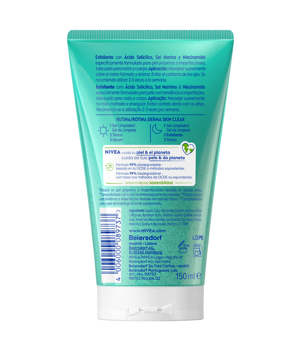 O Exfoliante Derma Skin Clear de NIVEA foi especialmente formulado para pele com tendência a imperfeições. Enriquecido com Ácido Salicílico, Sal Marinho e Niacinamida, desobstrui e aperfeiçoa os poros, reduz pontos negros e pontos brancos, sem ressecar a pele.