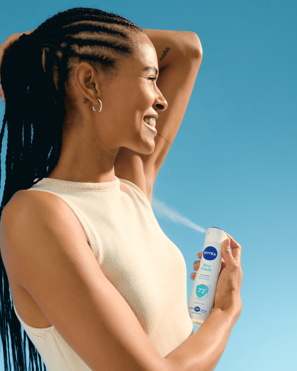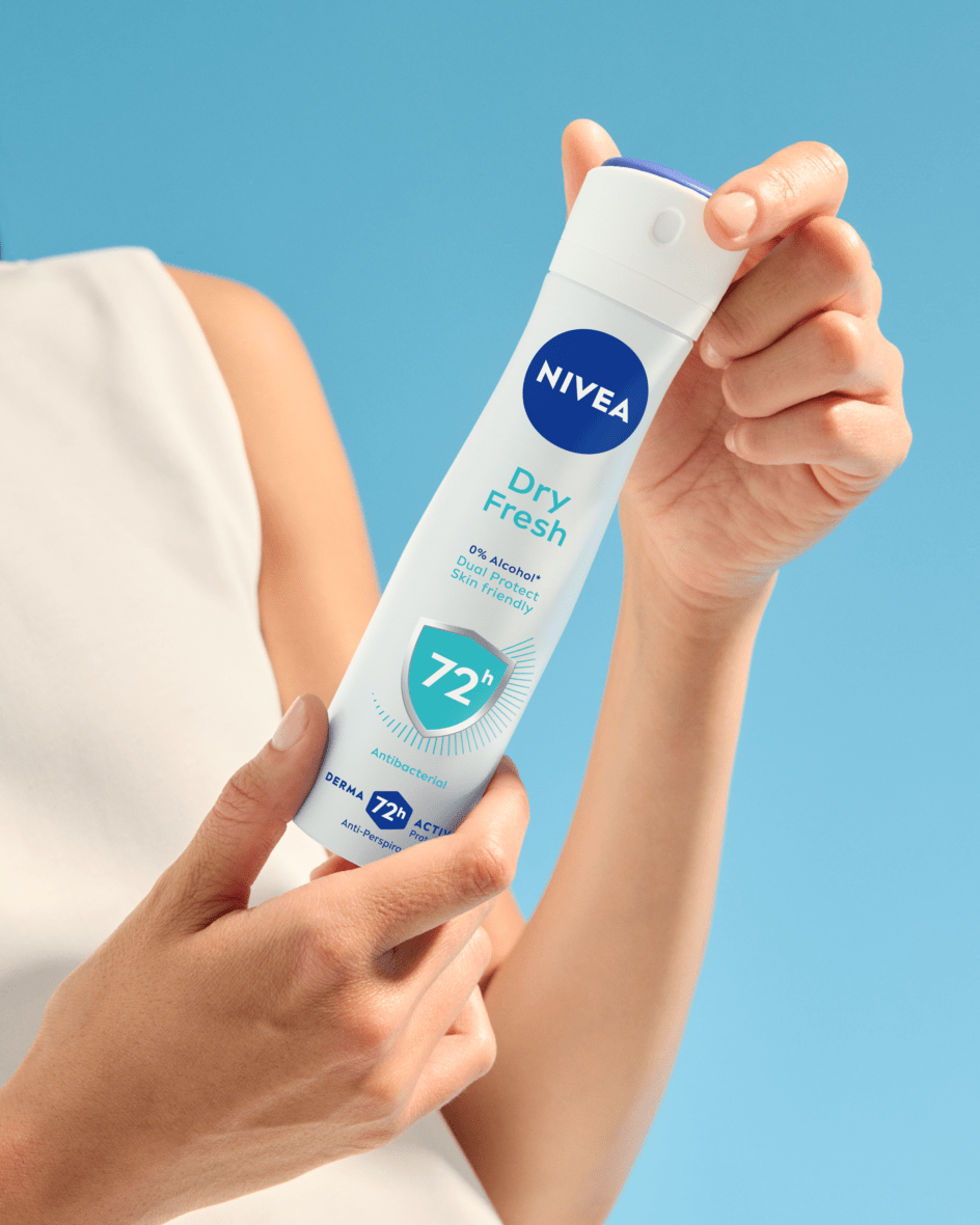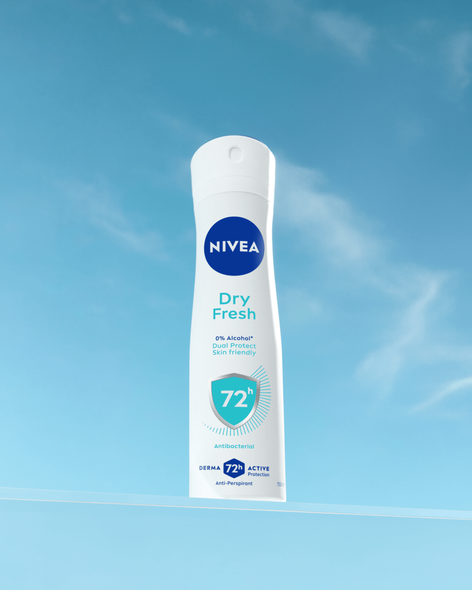 Fórmula com 2 ativos que formam uma barreira contra as bactérias para 72h de proteção antitranspirante eficaz que cuida da sua pele: NIVEA Dry Fresh Spray.