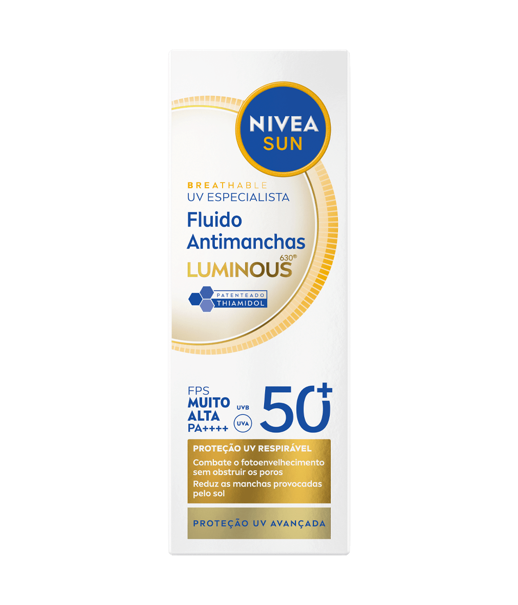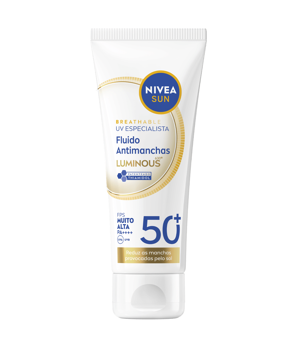 NIVEA SUN Fluido UV Rosto Especialista Antimanchas FP50+ combate o fotoenvelhecimento sem obstruir os poros. Previna e reduza visivelmente as manchas solares.
