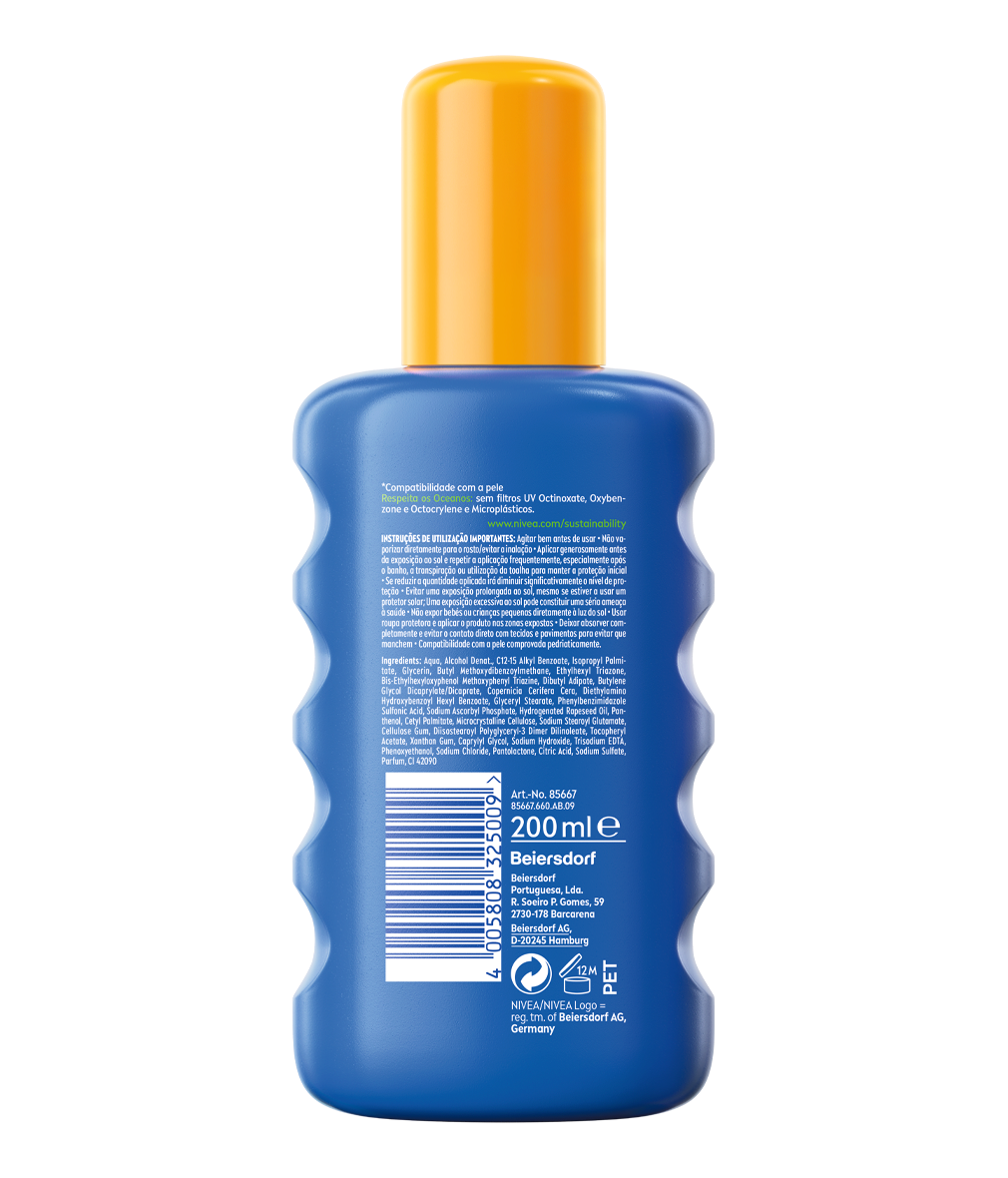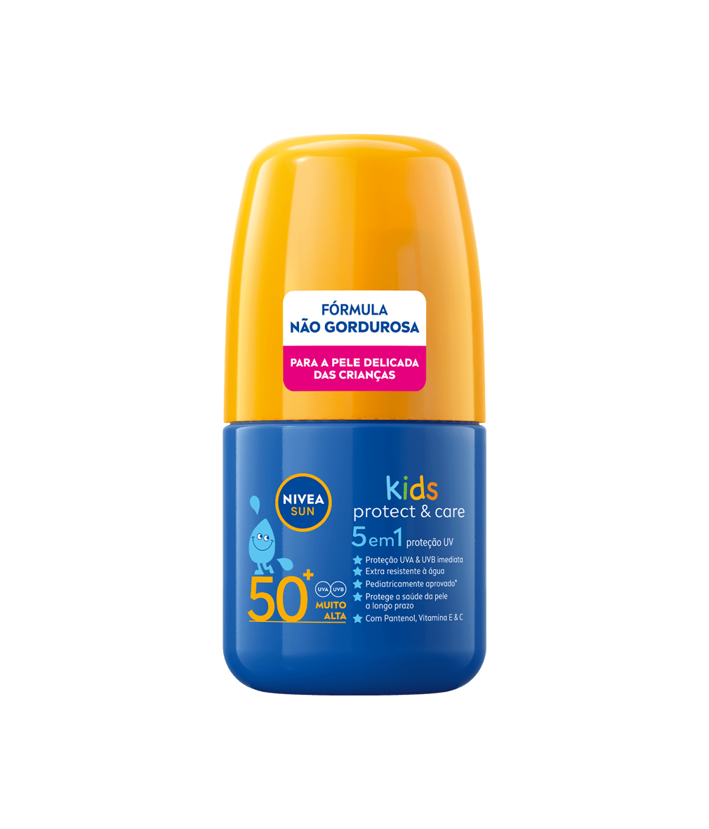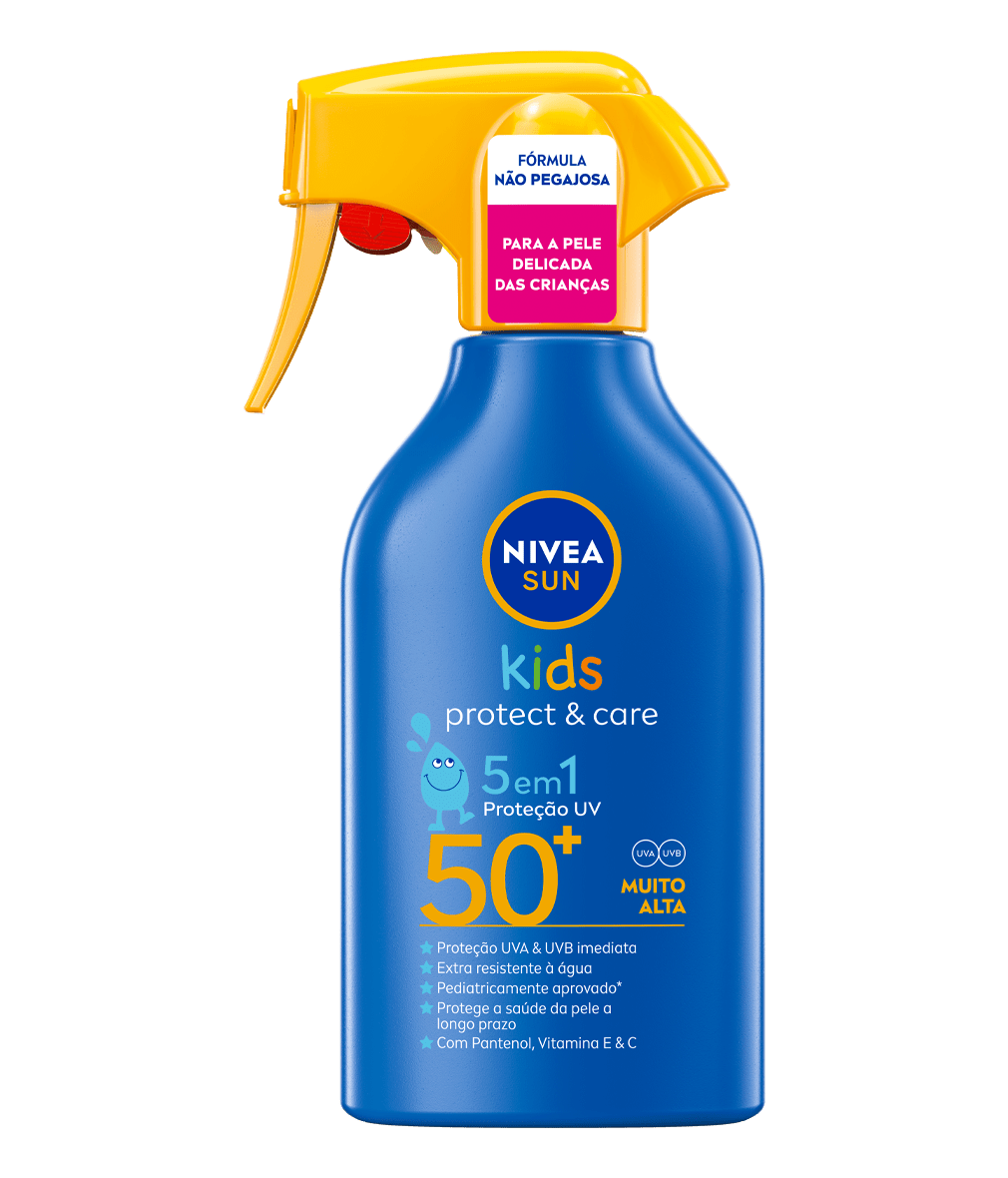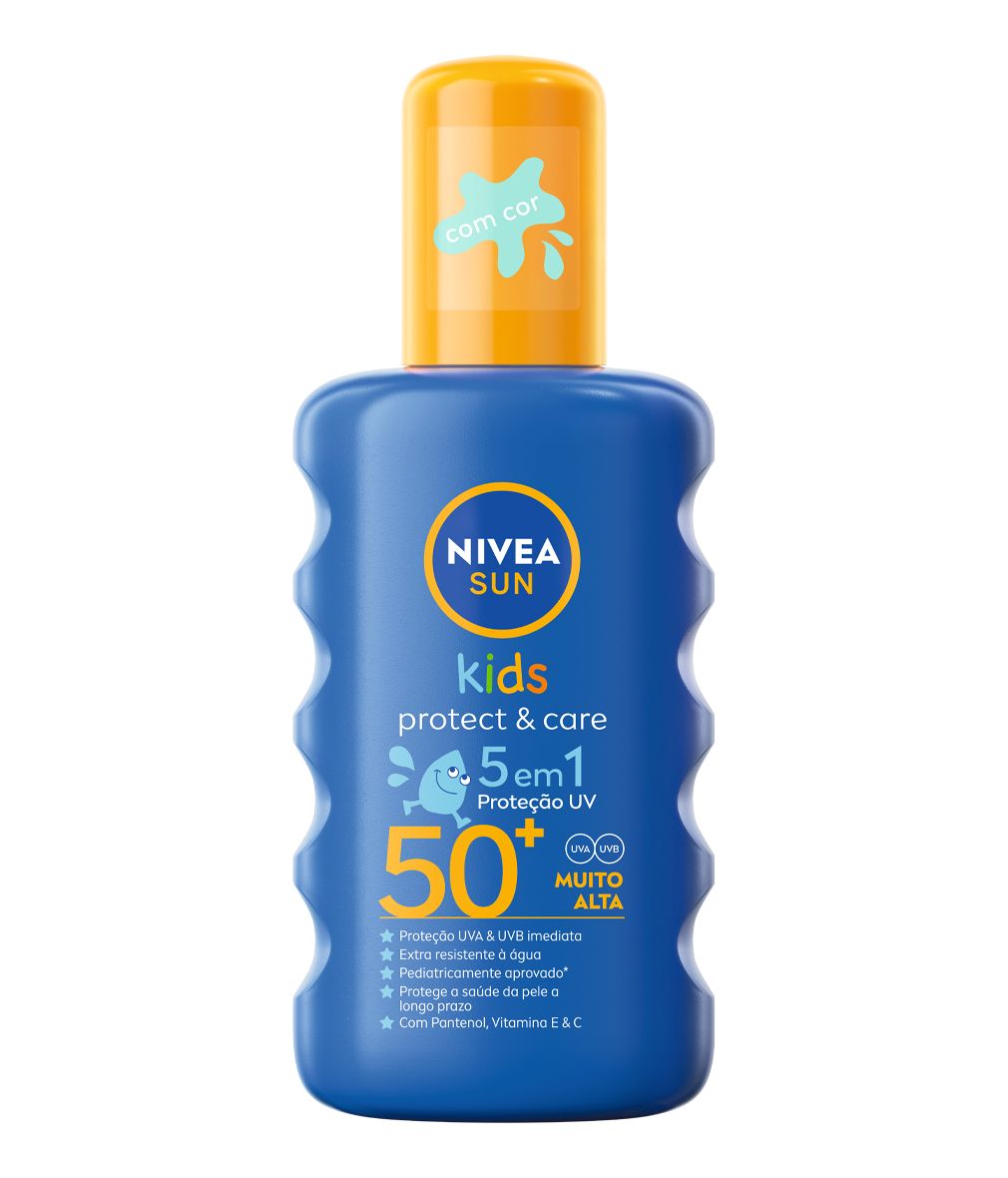Proteção UV confiável 5em1 adaptada às necessidades da pele delicada das crianças. Proteção UVA/UVB imediata com fórmula extra resistente à água: NIVEA SUN Spray Kids Protect & Care com Cor FP50+