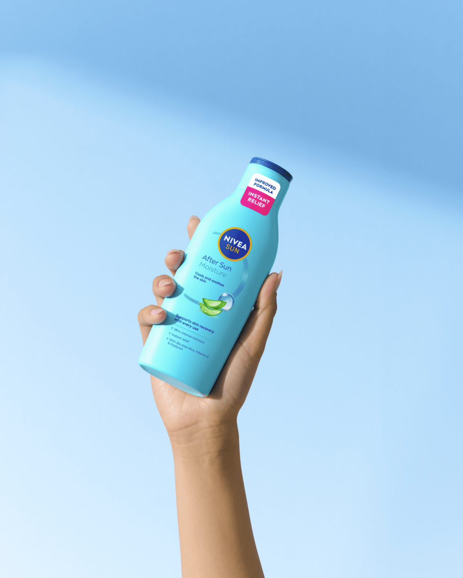 Proporciona um alívio imediato, suaviza e apoia a regeneração da pele stressada pelo sol - efeito hidratante durante 48h+, previne a descamação e proporciona uma sensação de pele revitalizada: NIVEA SUN Loção After Sun Moisture.