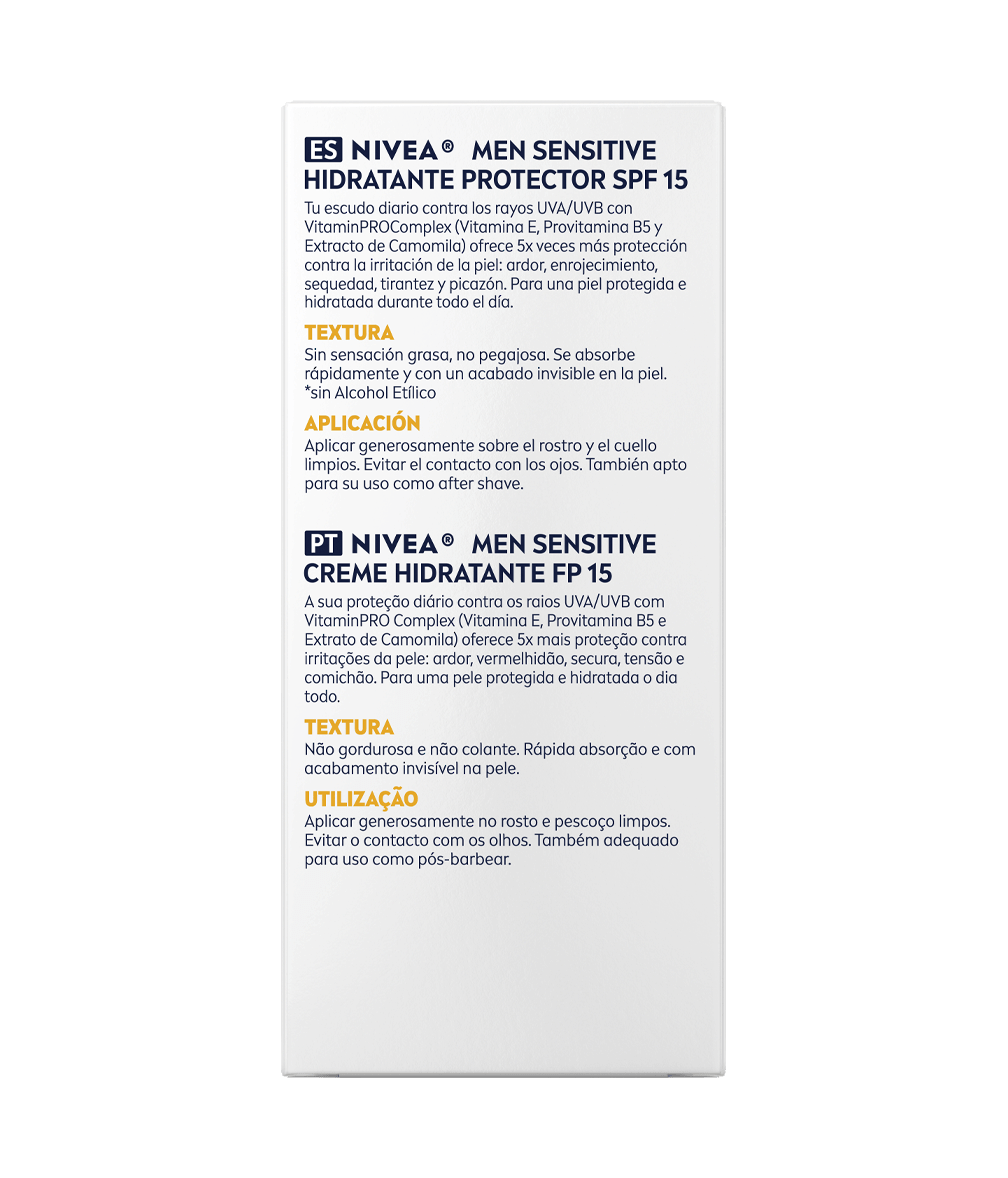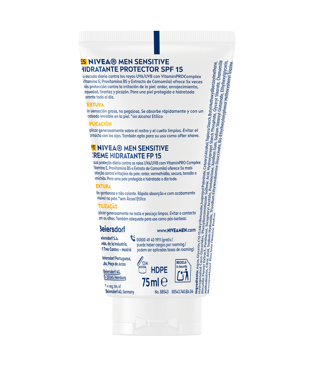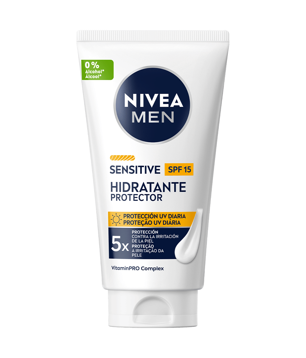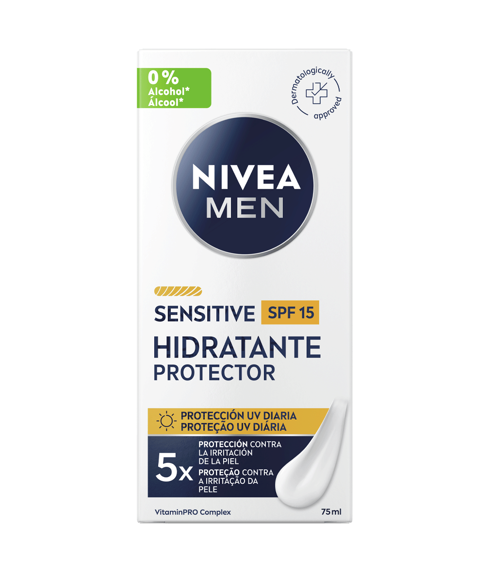 Pele irritada? Garante um alívio durante todo o dia com este creme de rosto que hidrata a pele com Complexo VitaminPro e protege o rosto e a zona do pescoço com FP15: NIVEA MEN Creme Hidratante Sensitive FP15.
