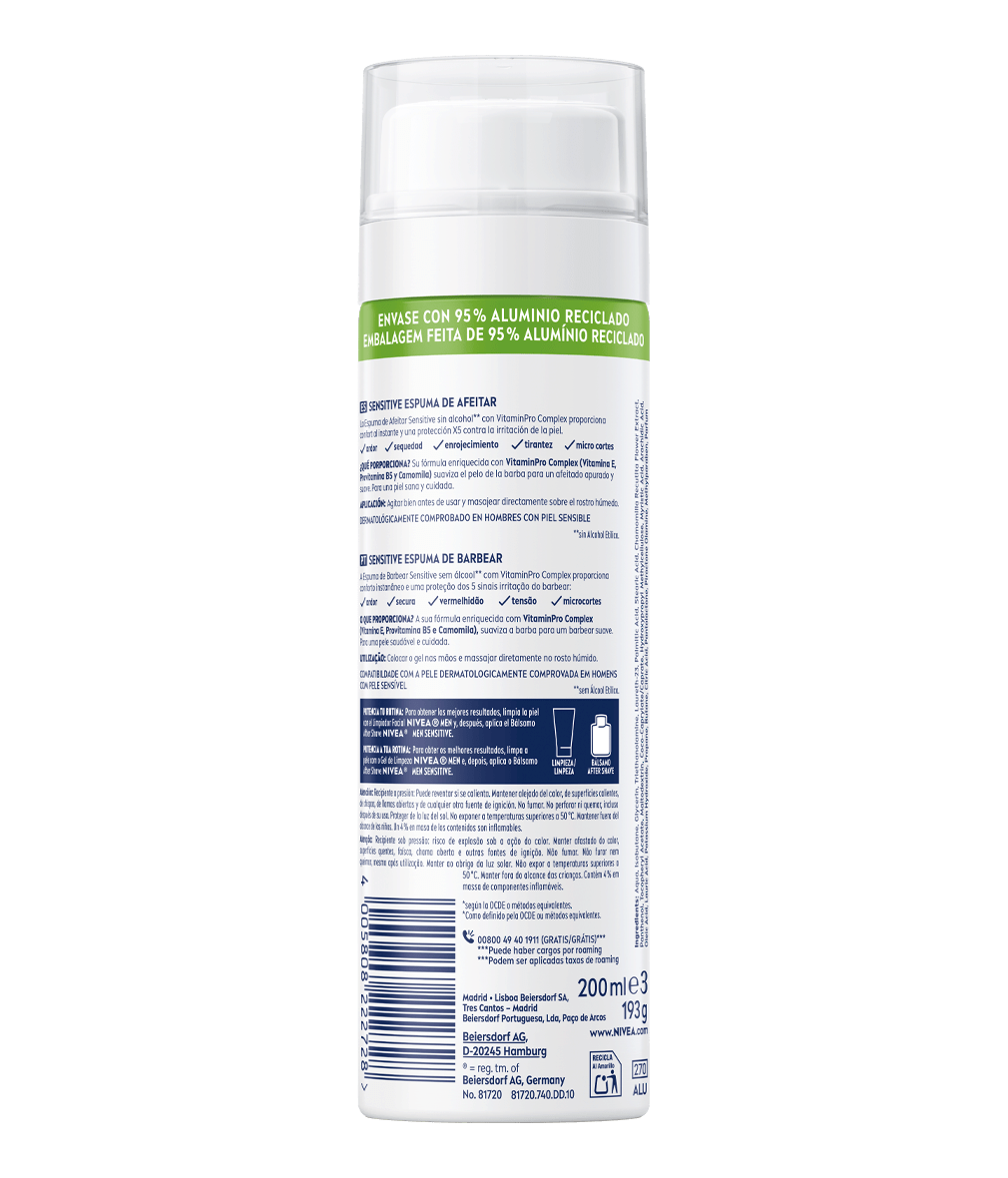 NIVEA MEN Espuma de Barbear Sensitive protege instantaneamente a pele contra os cinco sinais de irritação do barbear: ardor, secura, vermelhidão, tensão e microcortes. A fórmula com Tecnologia Ultra Glide suaviza o pelo da barba – para um barbear confortável e extremamente suave. A fórmula sem álcool* é dermatologicamente comprovada em homens com pele sensível. O resultado é uma pele confortável, suave, com um aspeto saudável e bem cuidada. A NIVEA cuida da tua pele e do planeta, com embalagem feita com 95% de alumínio reciclado e fórmula 99% biodegradável. *sem álcool etílico