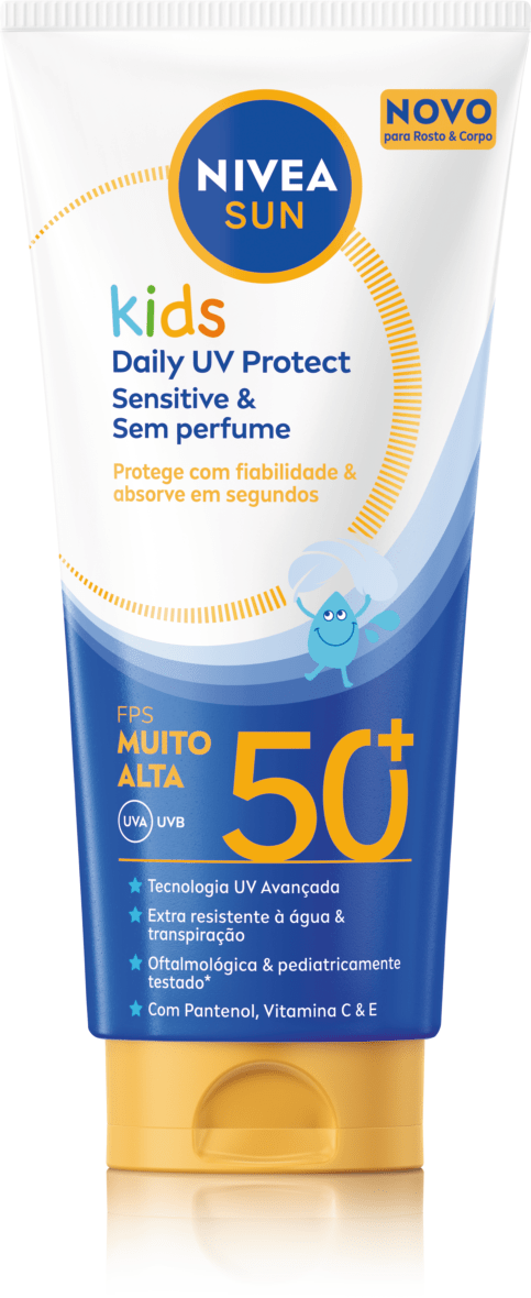 NIVEA Sun Kids Daily UV Protect FPS 50+ criado para a pele sensível das crianças. É sem perfume, absorve rapidamente e é resistente ao suor e à água — perfeito para uso diário no rosto e no corpo.