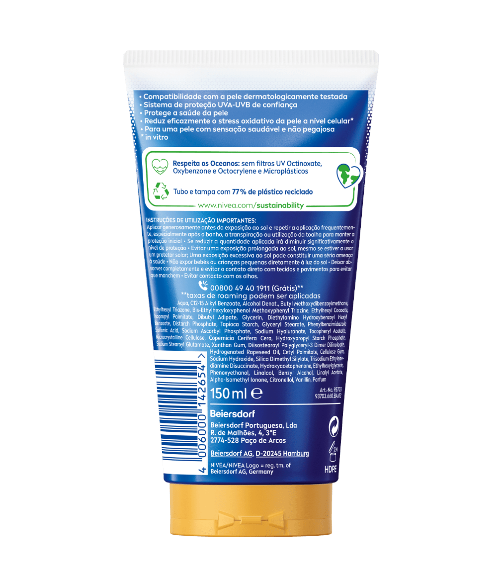 - Respeita os Oceanos: sem filtros UV Octinoxate, Oxybenzone, Octocrylene e sem Microplástico. Tubo e tampa feitos com 77% de plástico reciclado