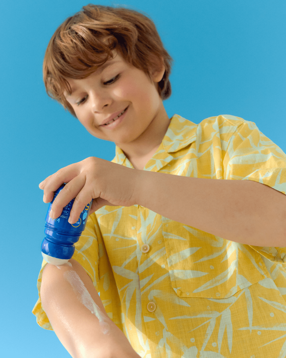 Proteção UV confiável 5em1 adaptada às necessidades da pele delicada das crianças. Proteção UVA/UVB imediata com fórmula extra resistente à água: NIVEA SUN Roll-on Kids Protect & Care FP50+
