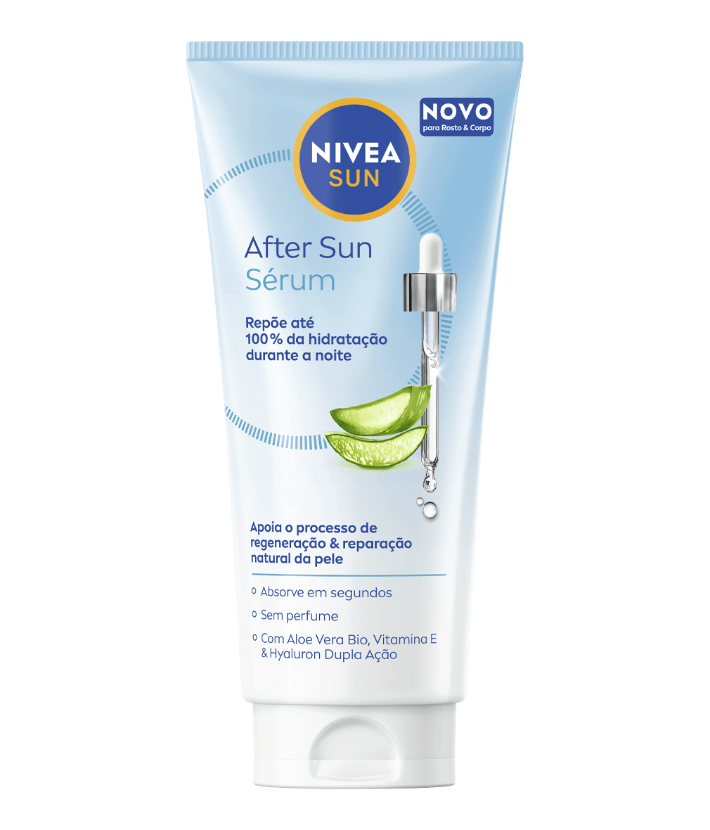 Repõe até 100% da hidratação durante a noite e apoia o processo natural de regeneração e reparação da pele stressada pelo sol - Fórmula sem perfume e ultraleve para rosto & corpo: NIVEA SUN Sérum After Sun Rosto & Corpo.