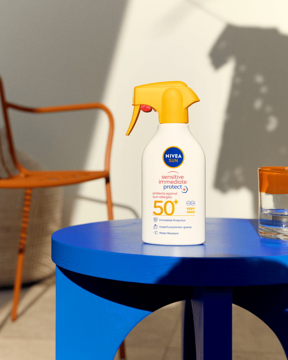 Proteção contra os danos causados pelos raios UV. Fórmula de cuidado com Aloe Vera e sem perfume para a pele sensível, em formato spray para uma aplicação fácil: Spray Sensitive Immediate Protect FP50+.