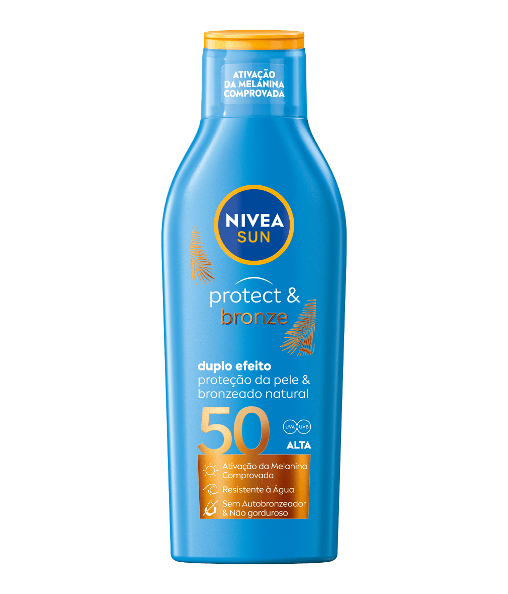 A proteção solar para um bronzeado bonito e uniforme. Duplo efeito: proteção da pele e bronzeado natural com ativação da melanina comprovada: NIVEA SUN Spray Óleo Protect & Bronze FP20 200ml.