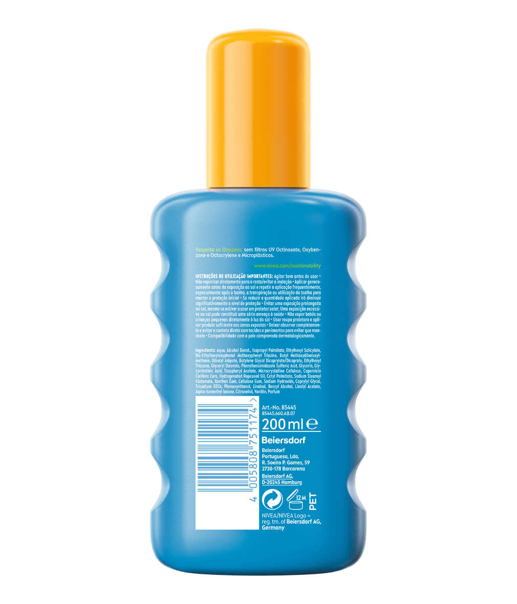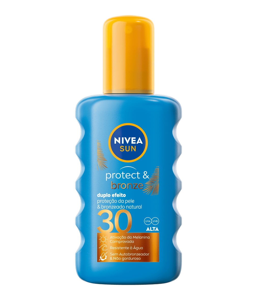 Proteção contra os danos causados pelos raios UV, enquanto estimula o bronzeado natural da própria pele. Duplo efeito: proteção da pele e bronzeado natural com ativação da melanina comprovada: NIVEA SUN Spray Protect & Bronze FP30.