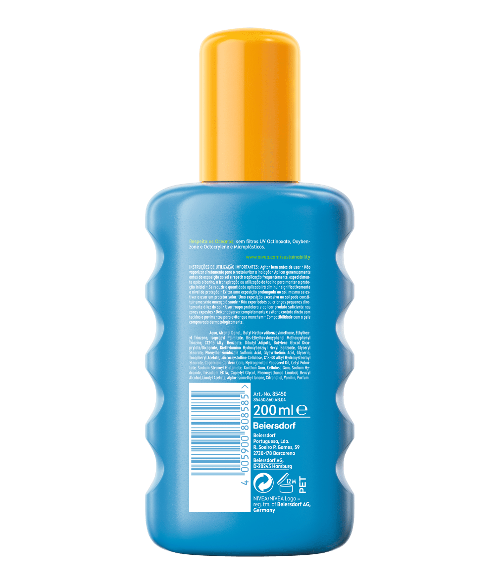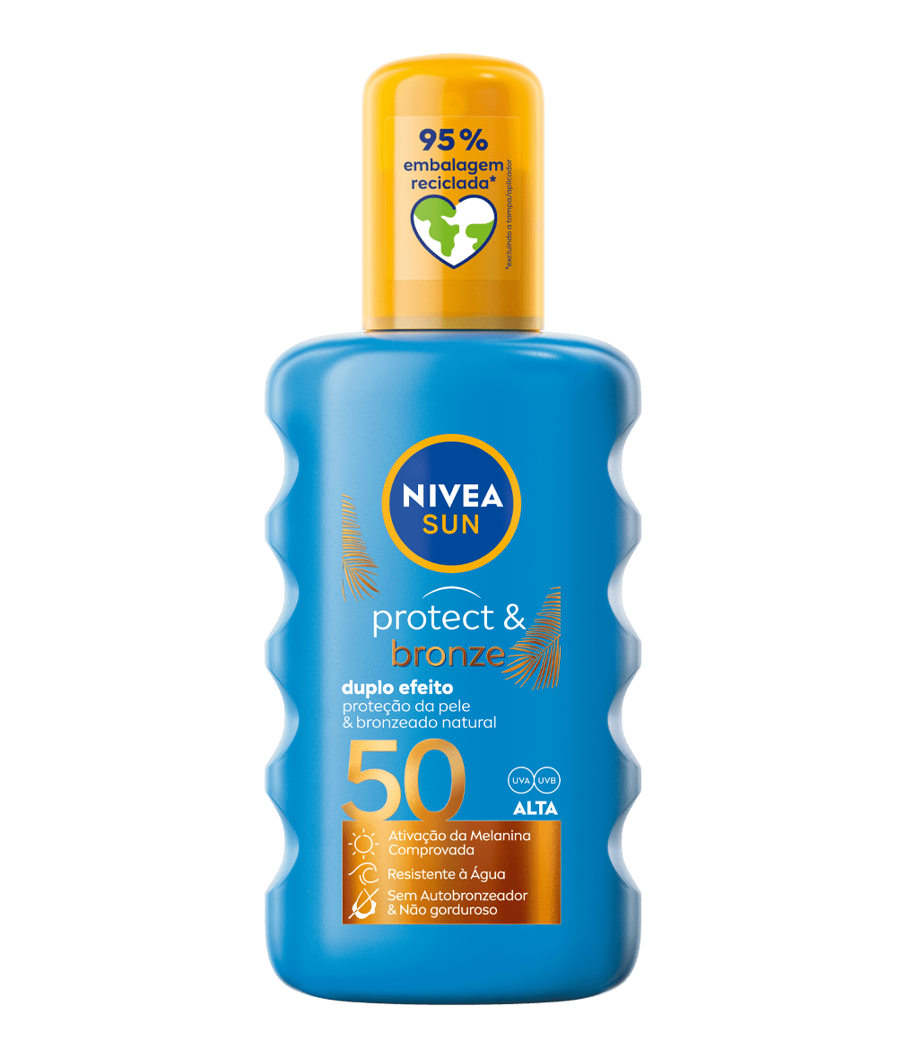 Proteção contra os danos causados pelos raios UV, enquanto estimula o bronzeado natural da própria pele. Duplo efeito: proteção da pele e bronzeado natural com ativação da melanina comprovada: NIVEA SUN Spray Protect & Bronze FP50.