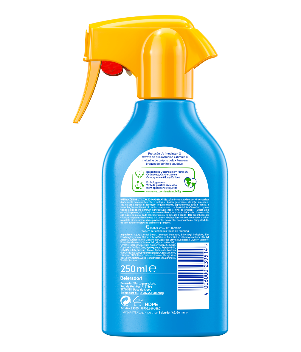 Proteção contra os danos causados pelos raios UV, enquanto estimula o bronzeado natural da própria pele. Duplo efeito: proteção da pele e bronzeado natural com ativação da melanina comprovada: NIVEA SUN Spray Protect & Bronze FP50.