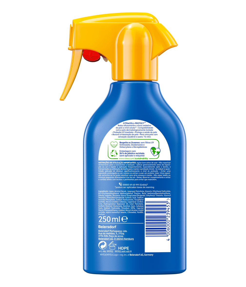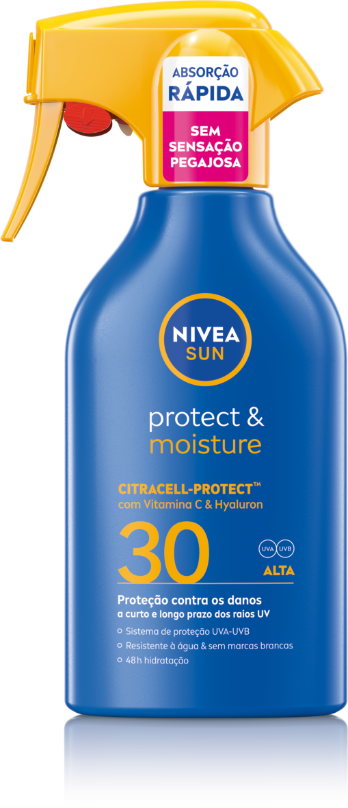 Proteção confiável contra os danos UV de curto e longo prazo com a fórmula CITRACELL-PROTECT™ de rápida absorção: NIVEA SUN Spray Protect & Moisture FP30.