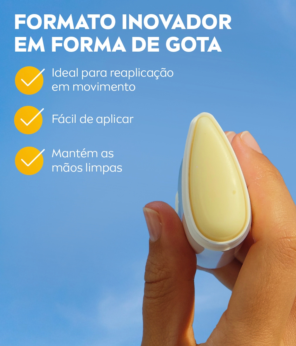 - PROTEGE AS ZONAS FACIAIS DELICADAS – A fórmula sem perfume, à prova de suor e de água, com formato em gota, não escorre para os olhos e é ideal para aplicar numa zona mais específica do rosto
