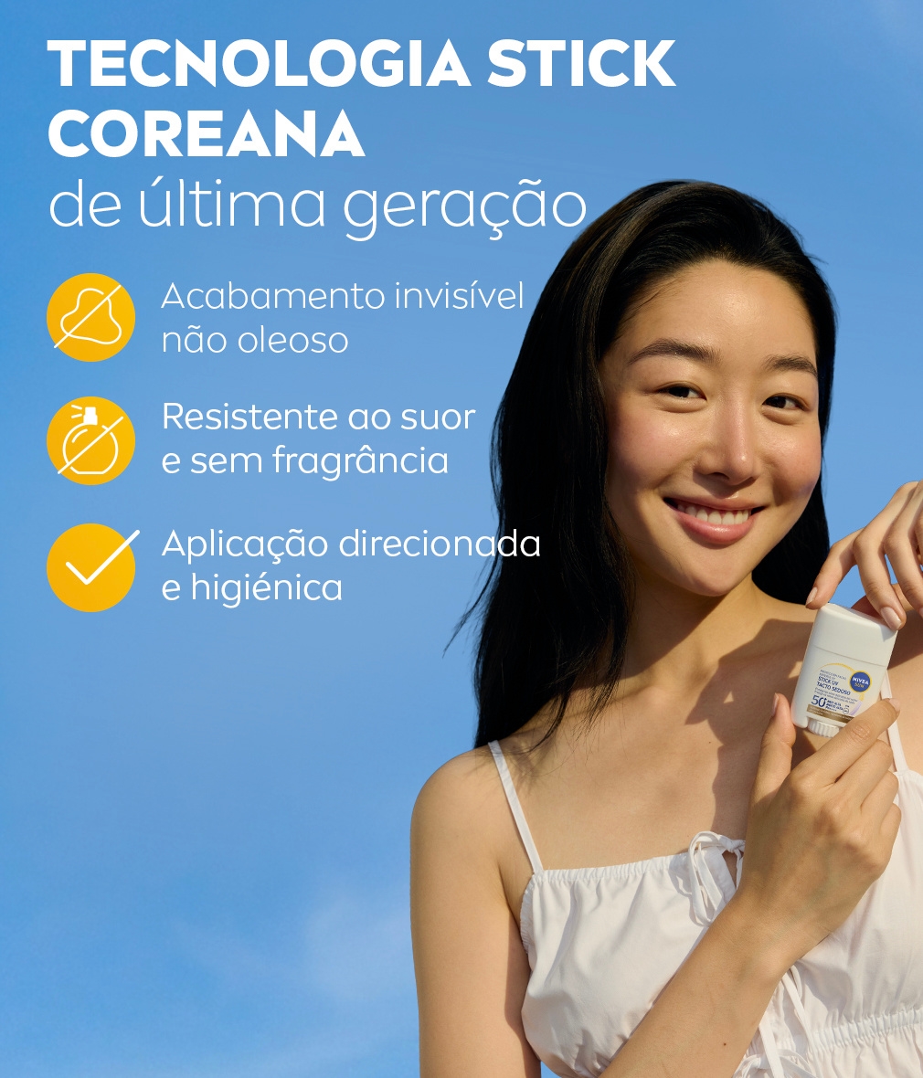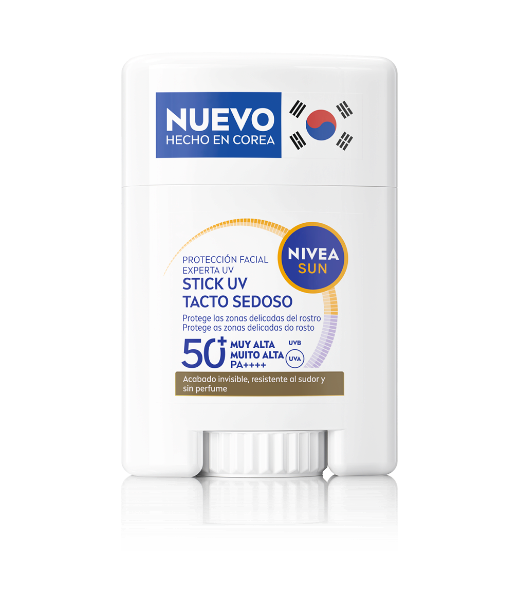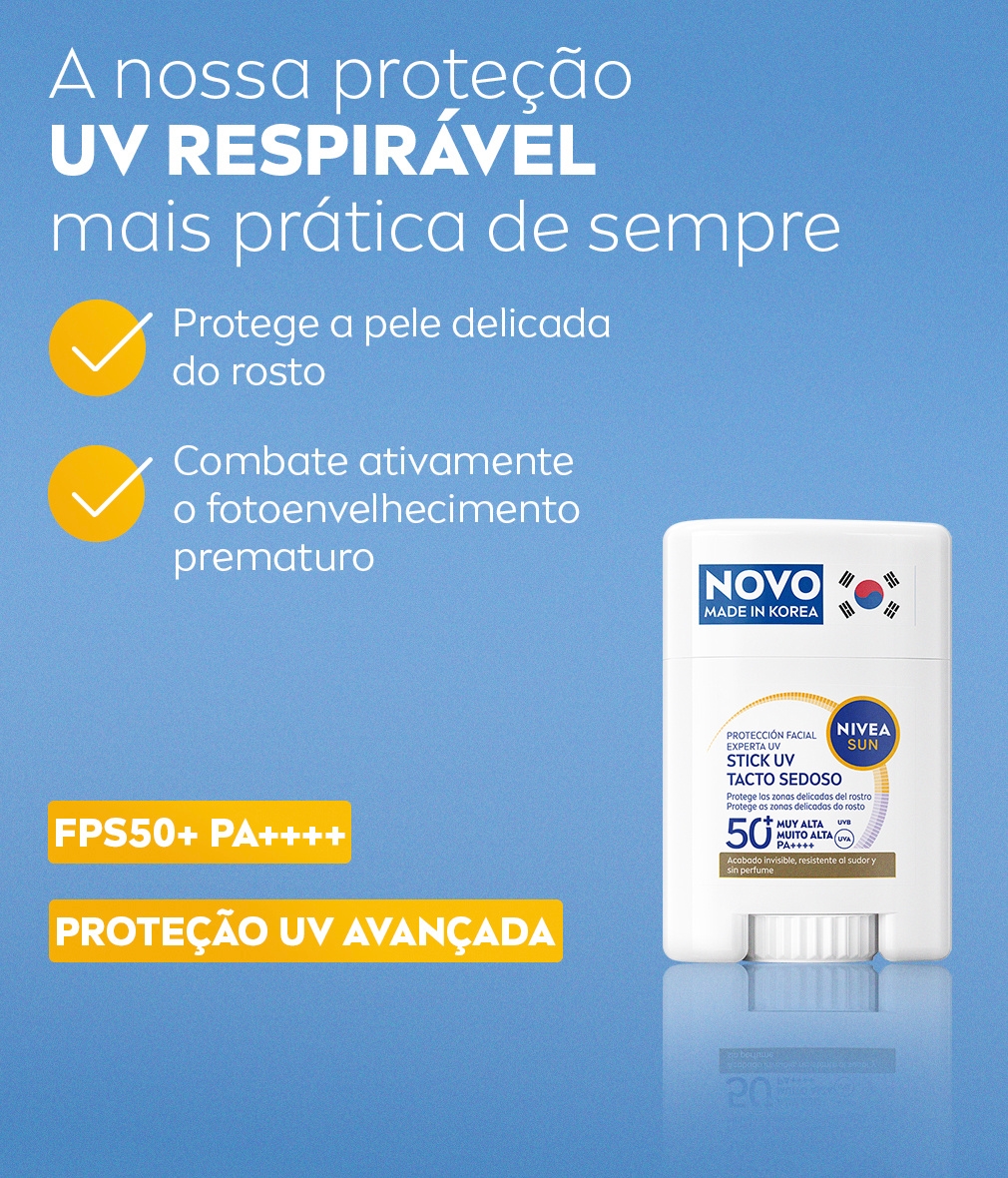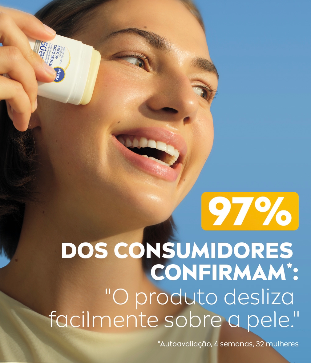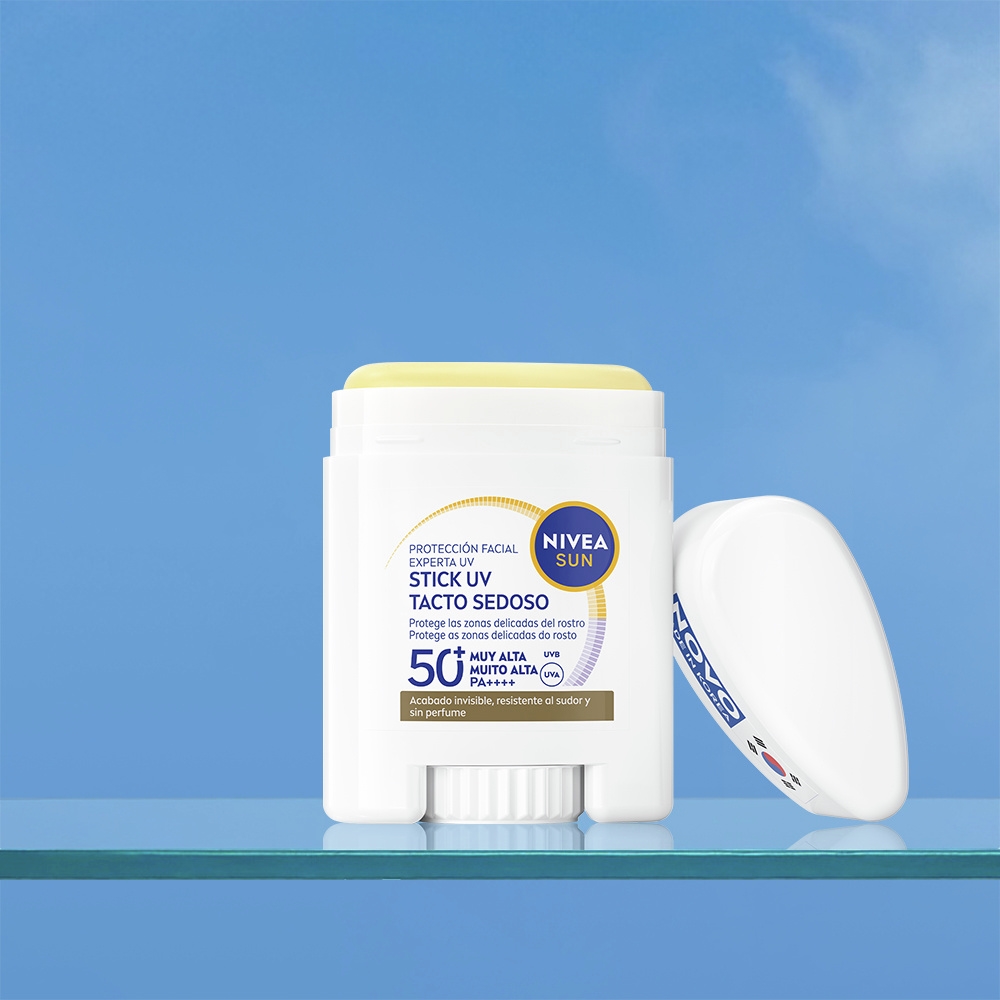 NIVEA SUN Stick UV Rosto Especialista FP50+ combate o fotoenvelhecimento sem obstruir os poros. Protege a pele delicada com um acabamento invisível, à prova de suor e sem perfume. Ideal para reaplicação.