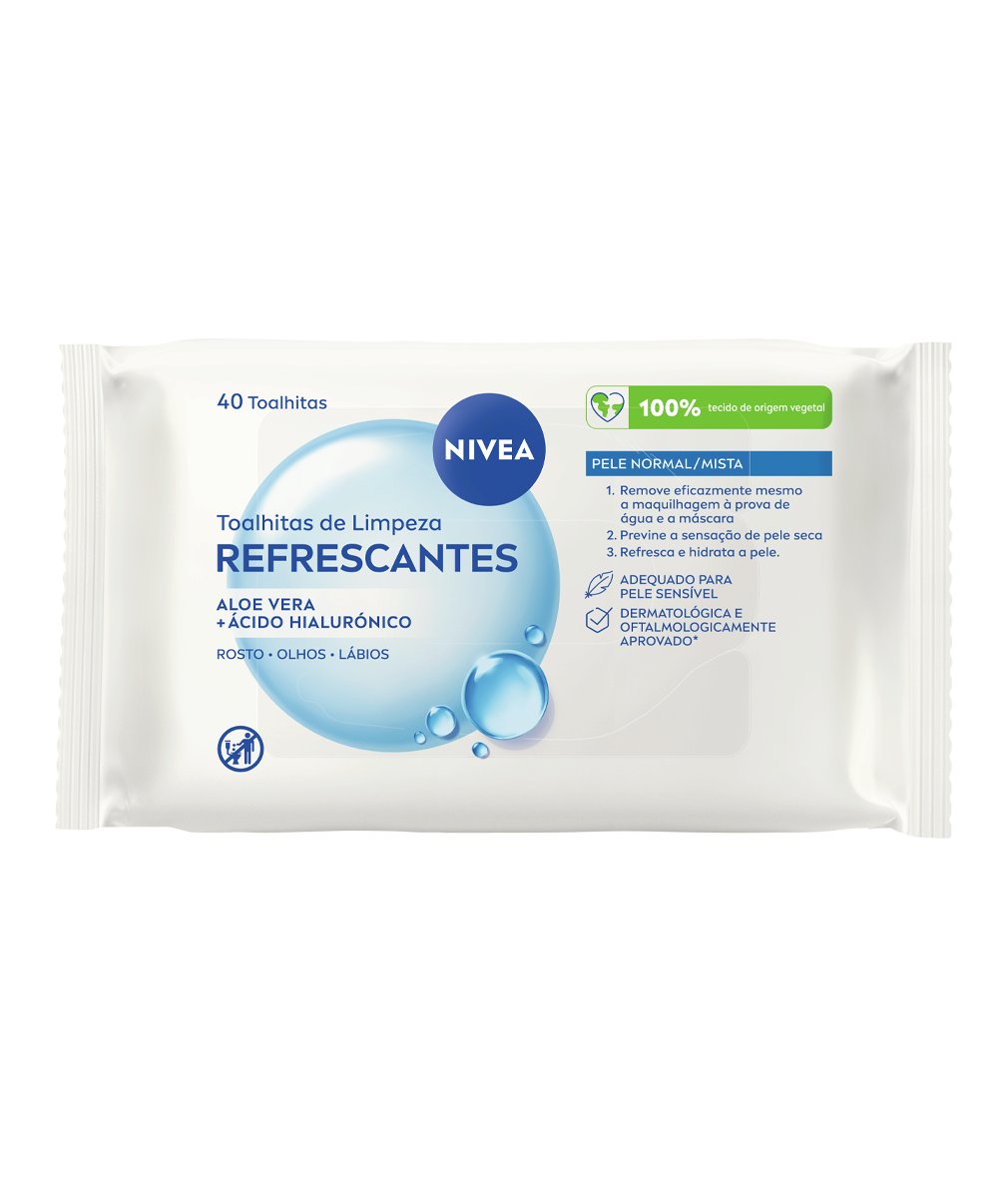 Graças à fórmula refrescante com Aloé Vera e Ácido Hialurónico, as toalhitas 100% de origem vegetal limpam suavemente e ajudam a manter o equilíbrio de hidratação da pele. Removem eficazmente até maquilhagem à prova de água e máscara, deixando a pele hidratada e fresca. NIVEA Toalhitas de Limpeza Refrescantes – 40 unidades